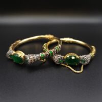These are beautiful green openable bangles with gold plating. Their design is elegant and stylish, making them a perfect match for both traditional and modern outfits. They’re sure to add a touch of charm and elegance to any look.