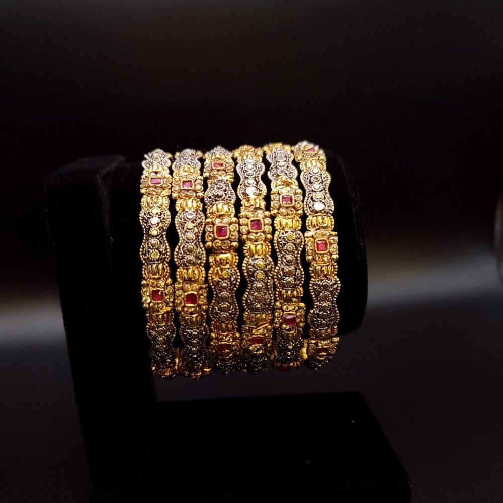 Six exquisite bangles adorned with maroon stones, featuring intricate Ganga-Jamuni craftsmanship.