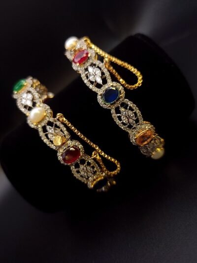 Adorn your wrists with these six exquisite bangles, each embellished with vibrant champion-colored stones, adding a touch of elegance and glamour to any outfit.