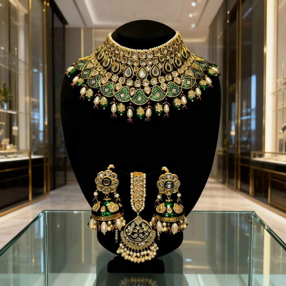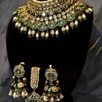 Experience the allure of tradition with our Green meena Kundan Polki necklace set. Timeless beauty awaits.