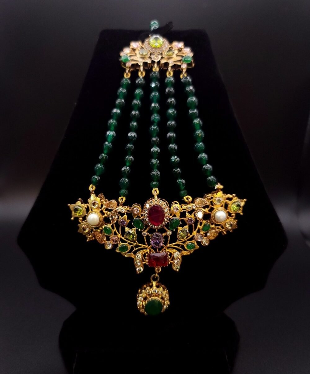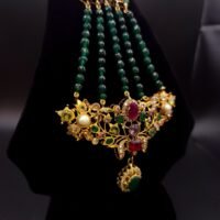 An exquisite traditional statement crafted in a rich gold-tone finish, featuring multiple strands of deep green beads for a regal look. The intricately designed centerpiece is adorned with vibrant red, green, and champagne stones, highlighted with elegant pearl accents. The detailed filigree work and hanging drop charm add a royal and luxurious touch, making it a perfect choice for weddings, festive occasions, and bridal wear. ✨