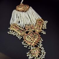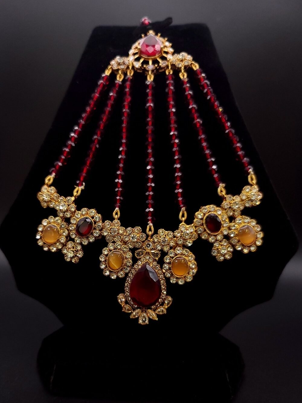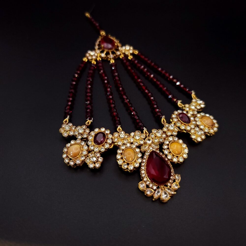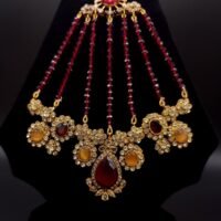 A breathtaking traditional jhumar featuring rich ruby-red crystal strands gracefully cascading from an ornate gold-tone top. The design is adorned with sparkling zircon stones, floral motifs, and elegant amber and deep red center stones that create a luxurious royal look. The statement teardrop pendant adds a bold finishing touch, making it perfect for bridal wear, festive occasions, and grand celebrations.