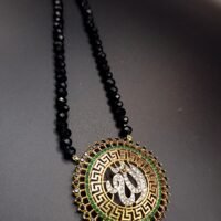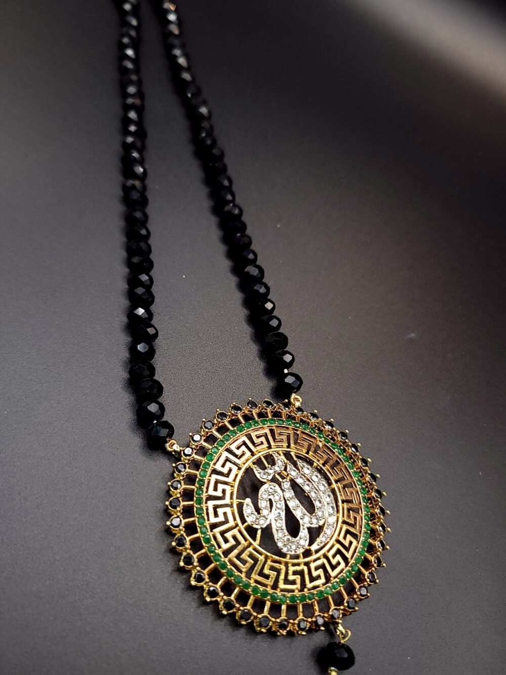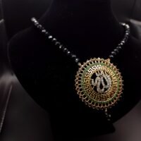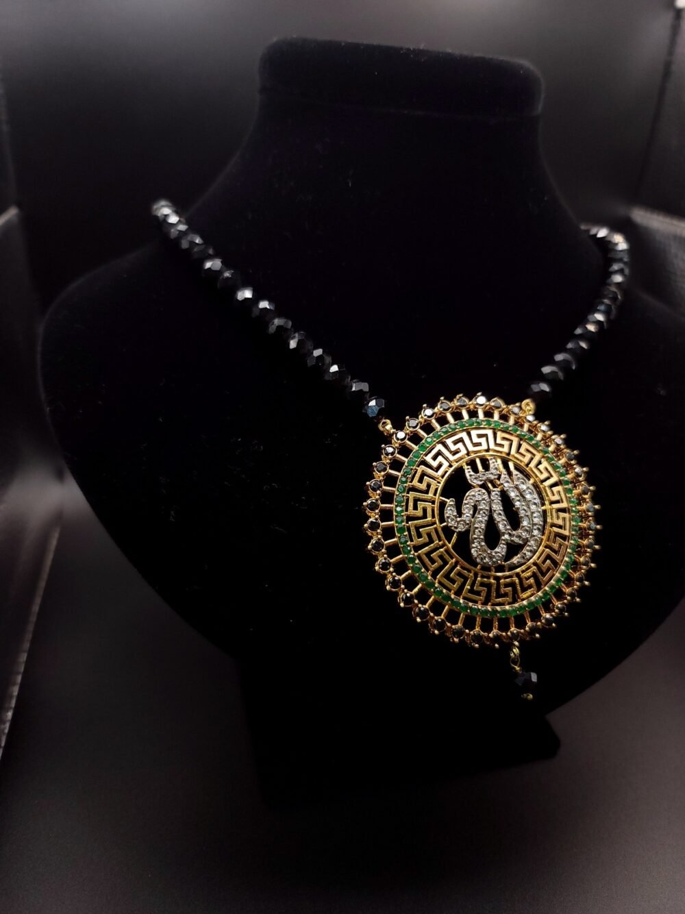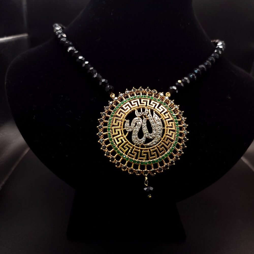 A graceful mala featuring a beautifully crafted Allah calligraphy pendant, adorned with sparkling white stones and vibrant red, green, and blue accents. The intricate design and pearl drop detail create a perfect blend of tradition and elegance, making it ideal for special occasions or spiritual wear.