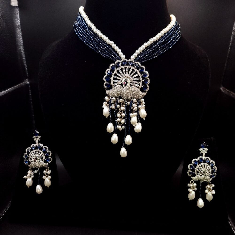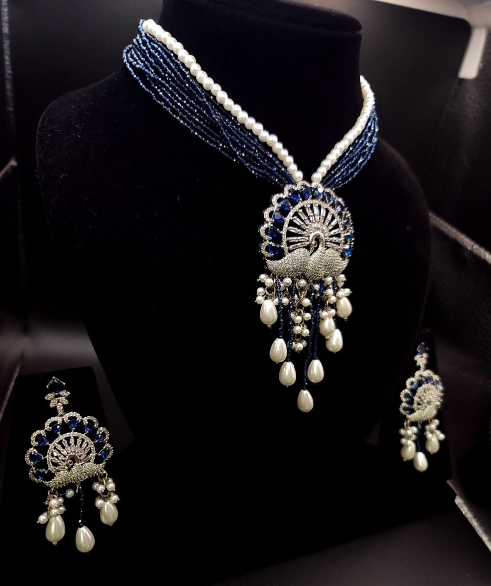 An elegant royal navy blue mala beautifully adorned with striking red and sparkling white stones. The deep blue shade gives a rich and classy look,. The white stones enhance the shine, making it perfect for weddings, festive occasions, and special events.