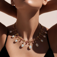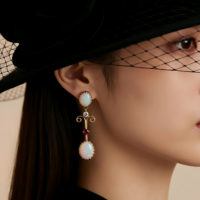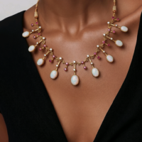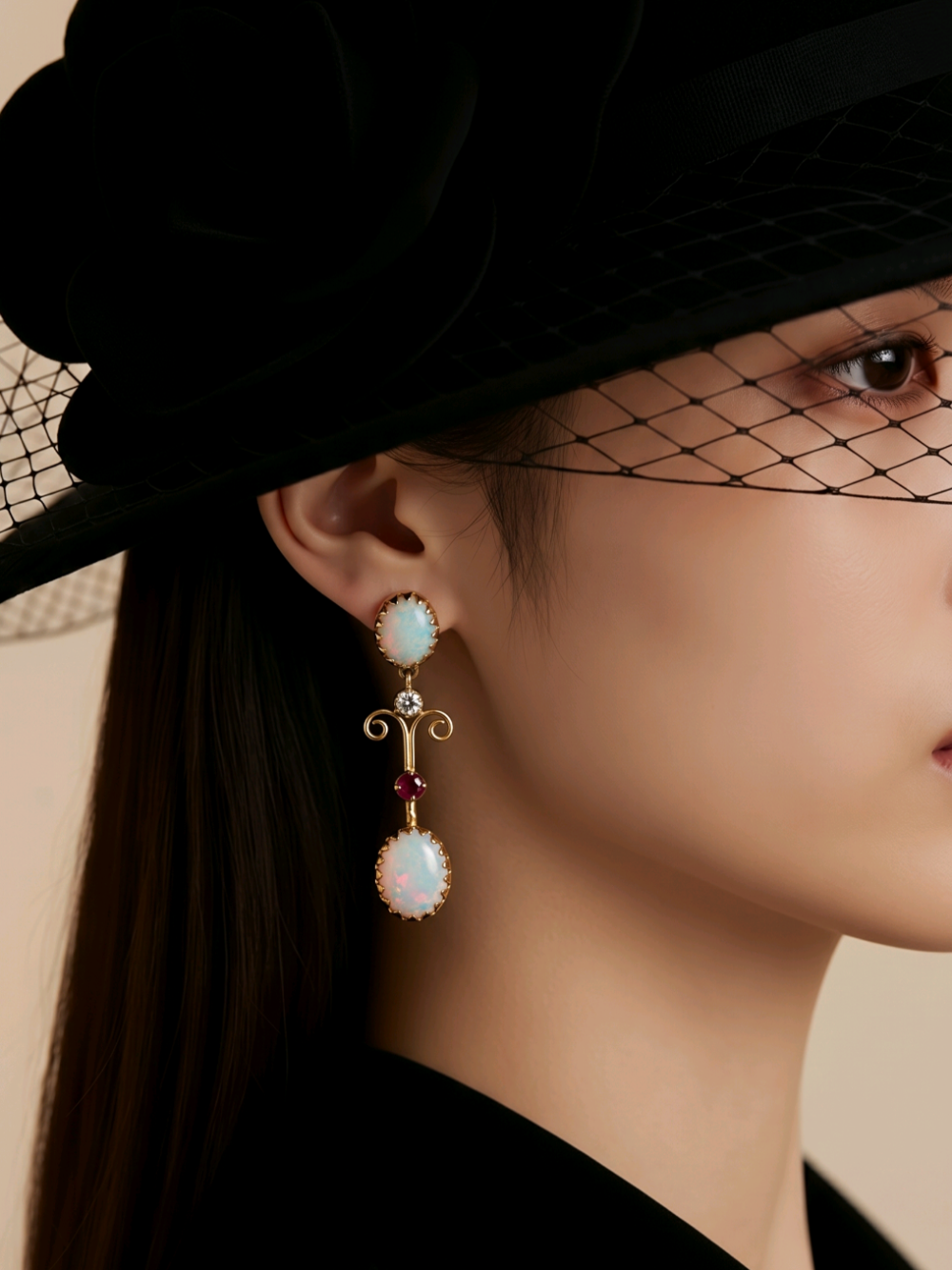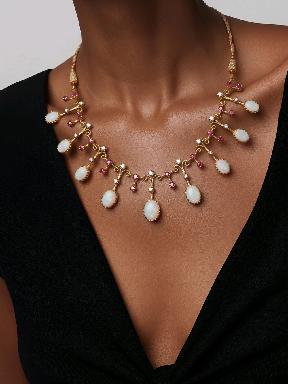 This is a delicately designed jewelry set featuring luminous opal stones, accented by rich ruby-hued gems and sparkling zircon work, this set is a masterpiece of delicate craftsmanship The intricate, graceful design evokes a timeless elegance, perfect for any special occasion.