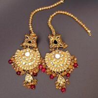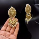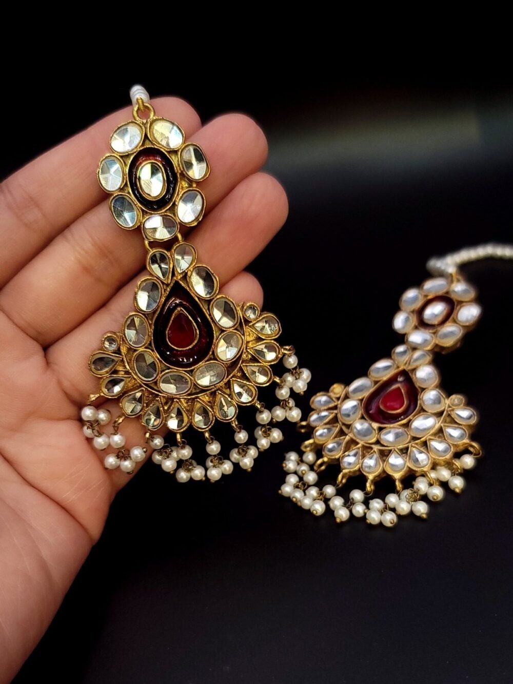 “Elegant earrings with a striking red center stone, adorned with Meena enamel work and delicate pearls for a timeless.