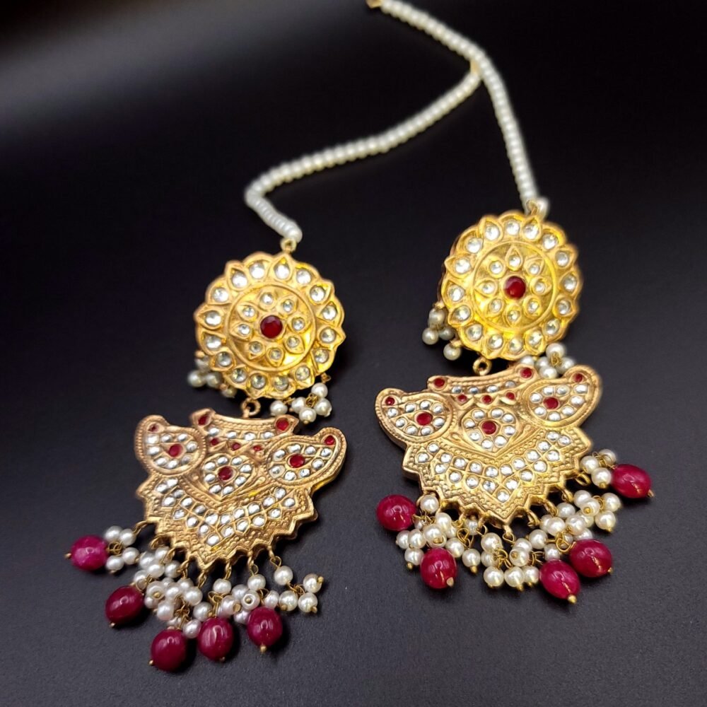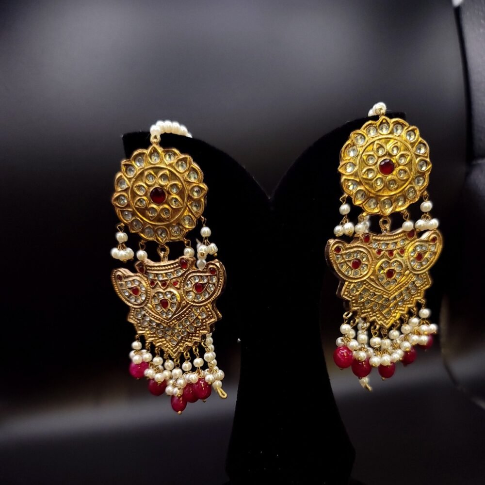 This Earings features an exquisite gold-plated and polki design, adorned with rich maroon stones and elegant pearls.