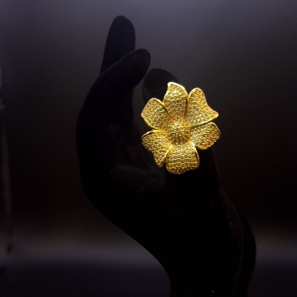 A stunning floral-inspired ring, beautifully detailed with shimmering stones that create a radiant bloom effect. Its bold yet graceful design makes it perfect for festive wear and special occasions, adding a touch of timeless glamour to your look. ✨