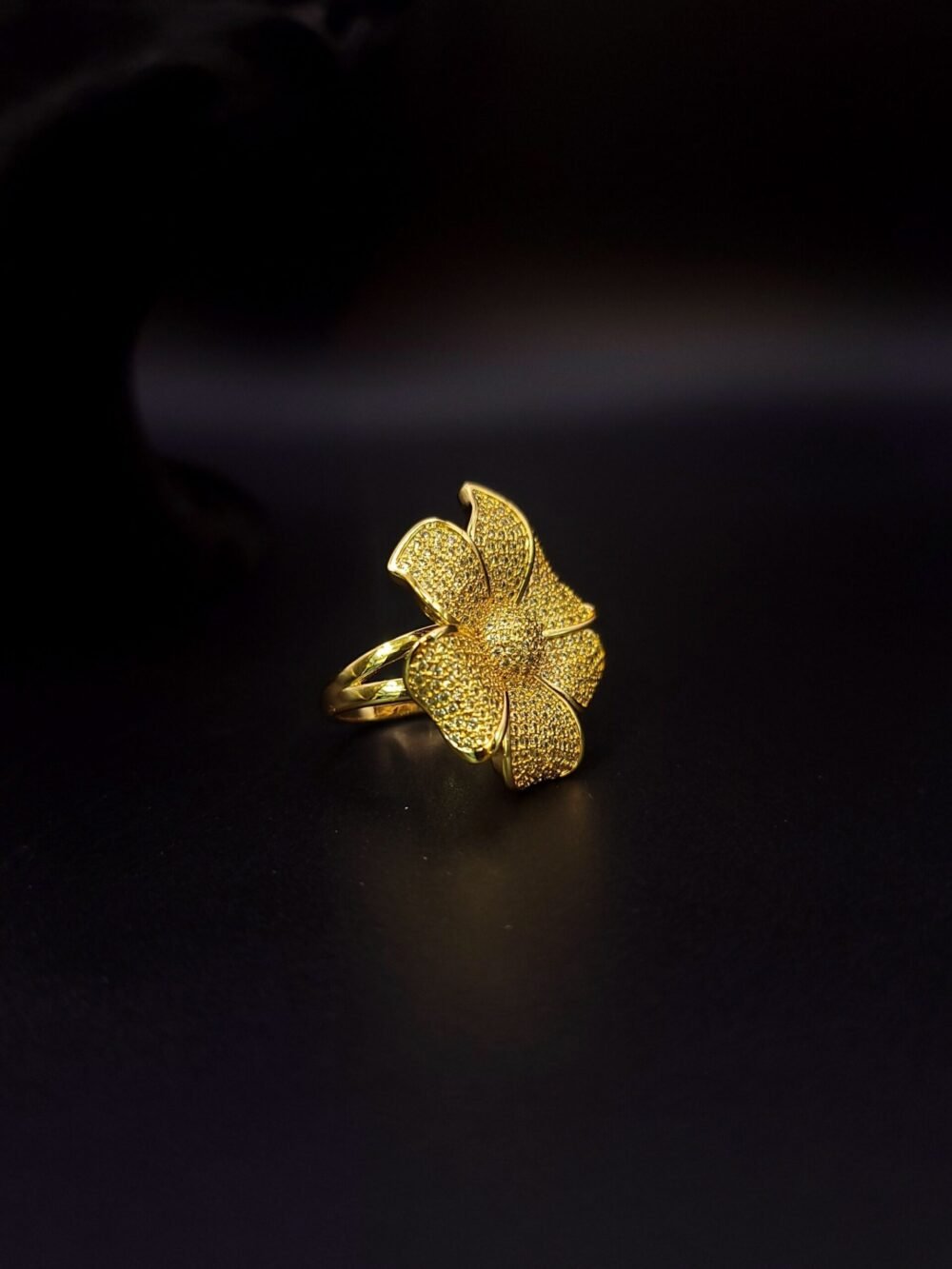 A stunning floral-inspired ring, beautifully detailed with shimmering stones that create a radiant bloom effect. Its bold yet graceful design makes it perfect for festive wear and special occasions, adding a touch of timeless glamour to your look. ✨